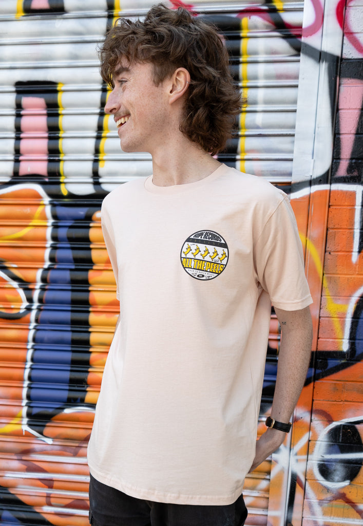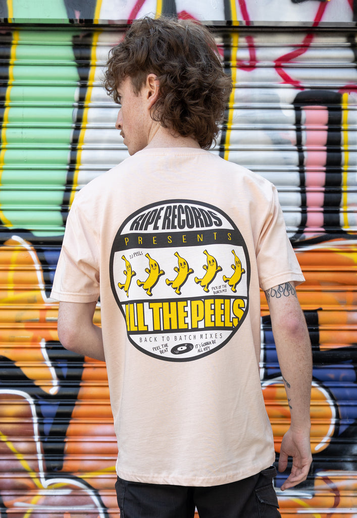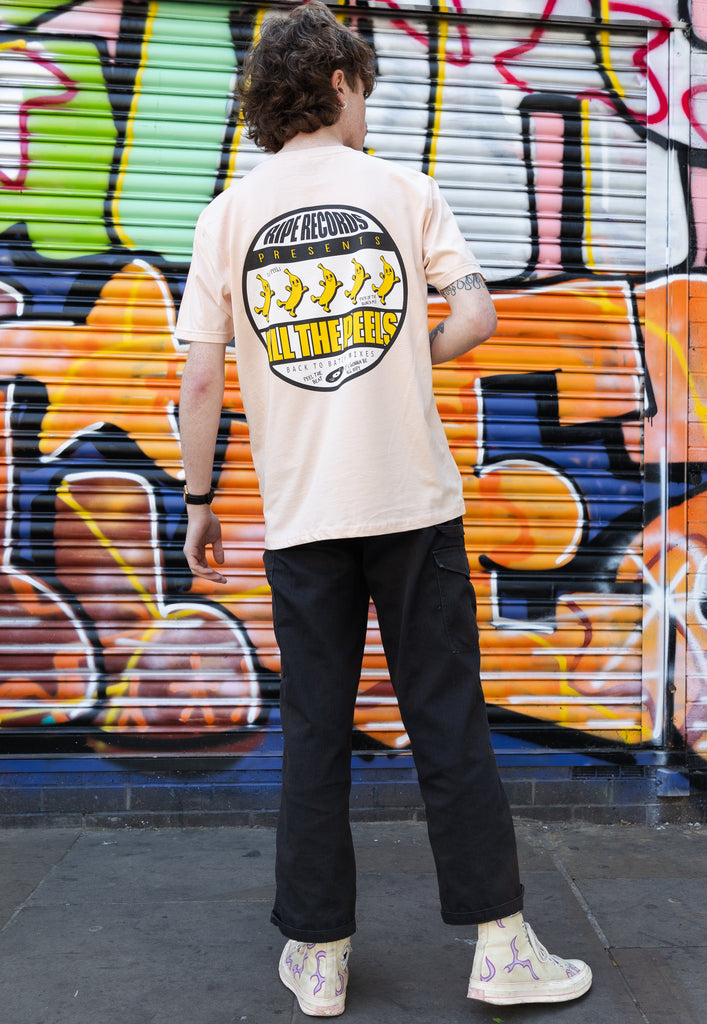 Graphics: 90s style rave vinyl record logo, dancing banana characters. Small logo front left chest, large back print.