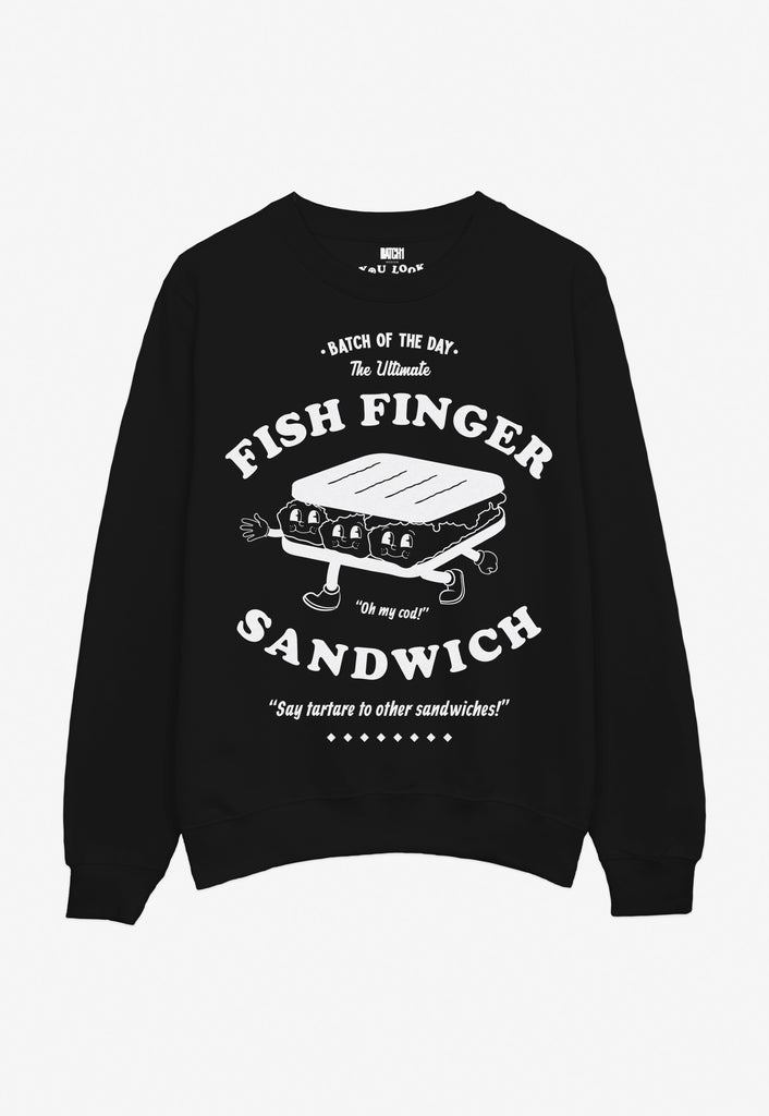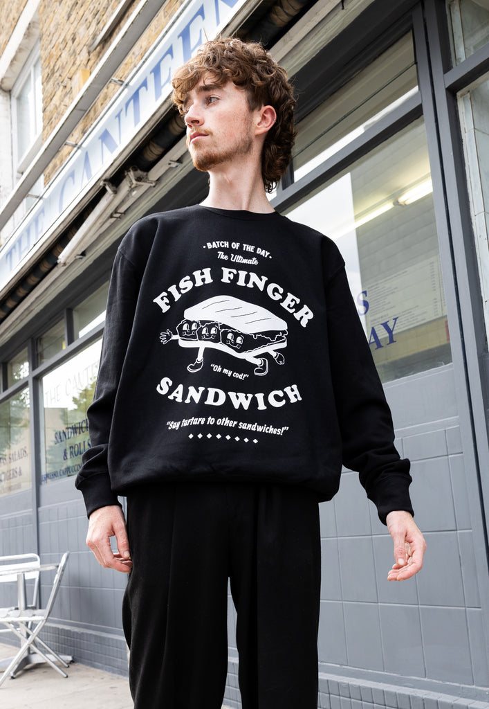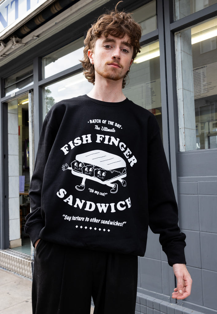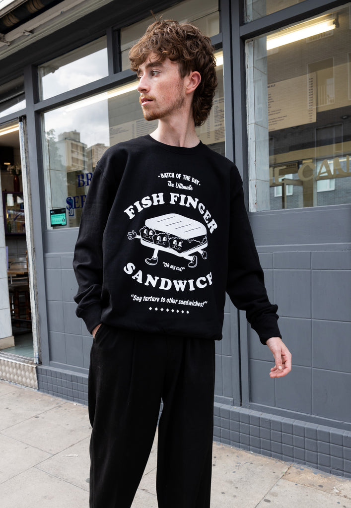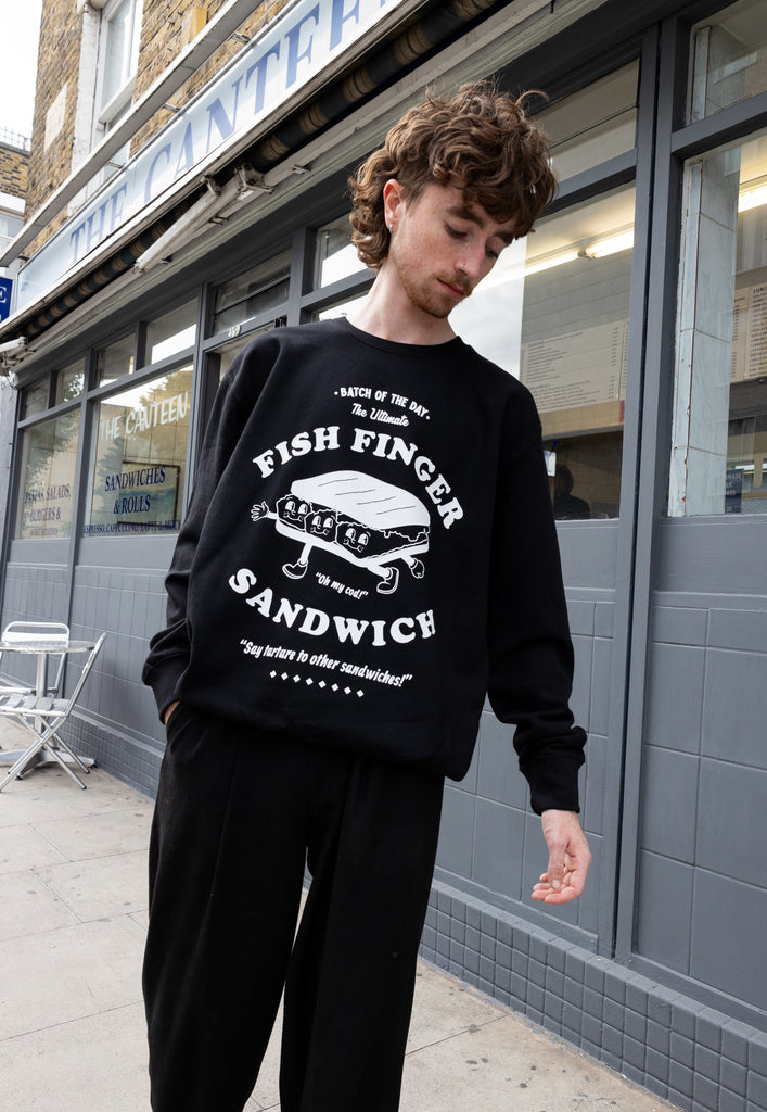 Relaxed crew neck black sweater with printed fish finger sandwich logo and vintage style character.