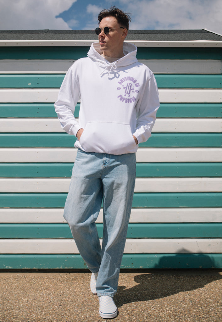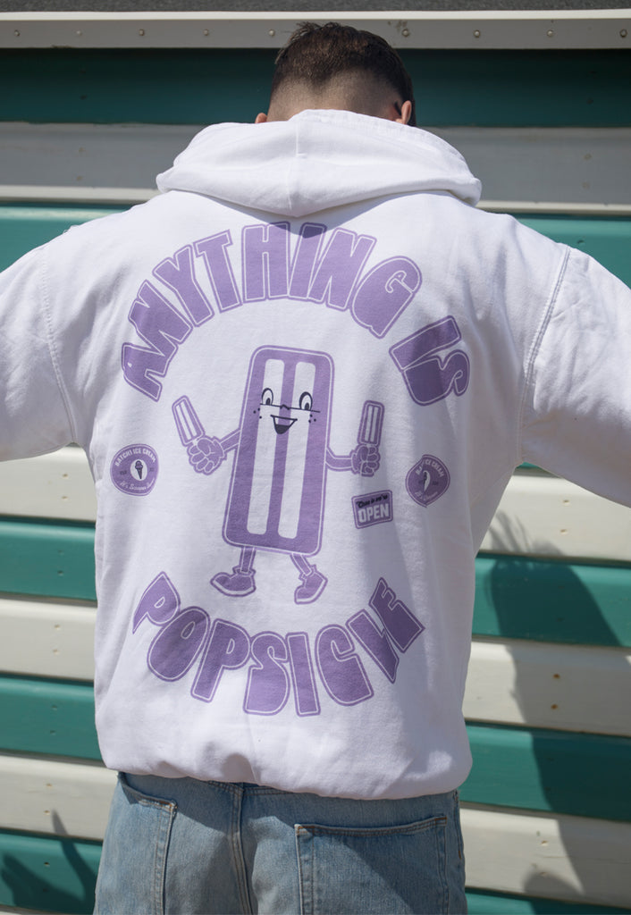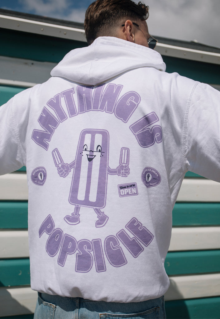 Batch1Men's printed hoodie with “Anything Is Popsicle” slogan and vintage popsicle guy graphic.