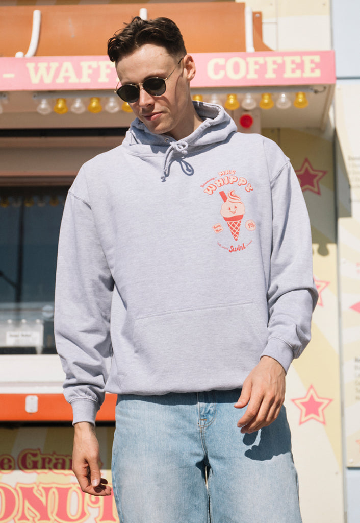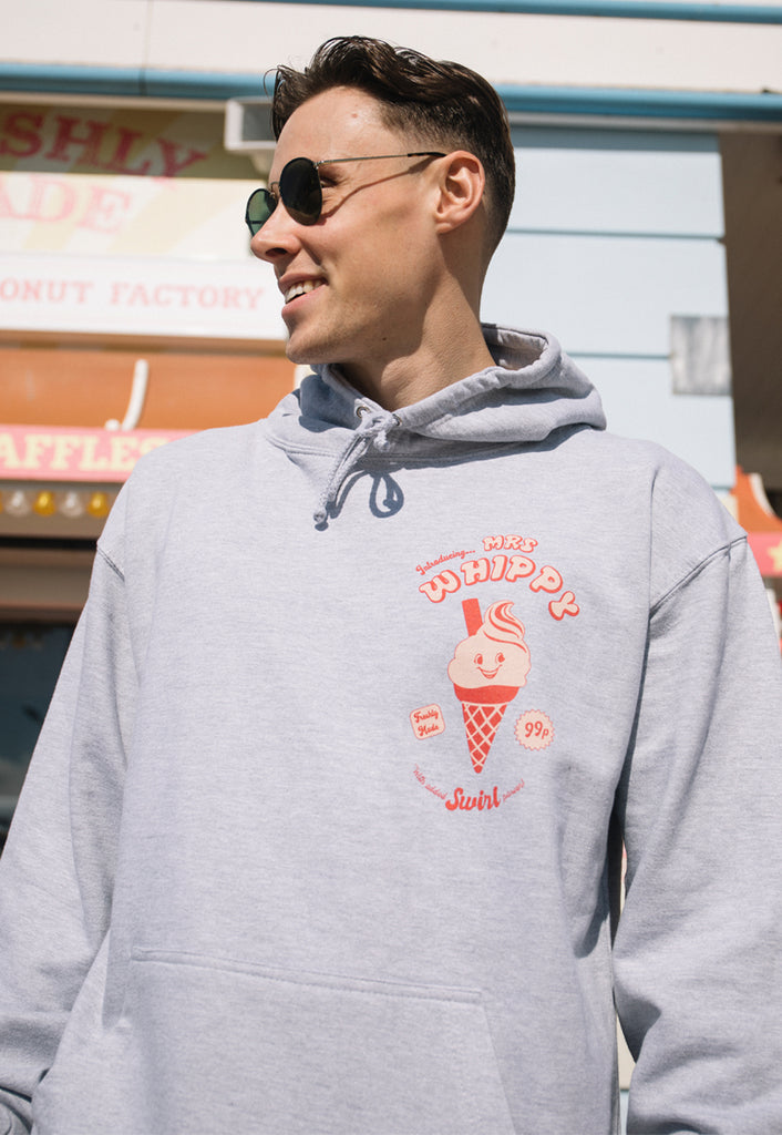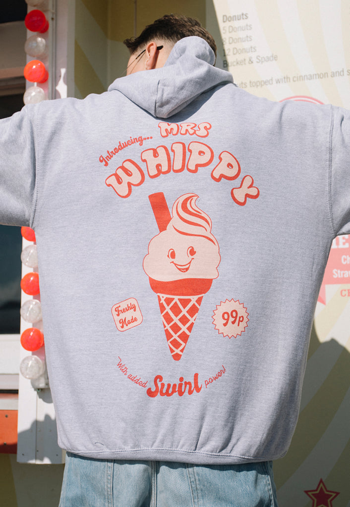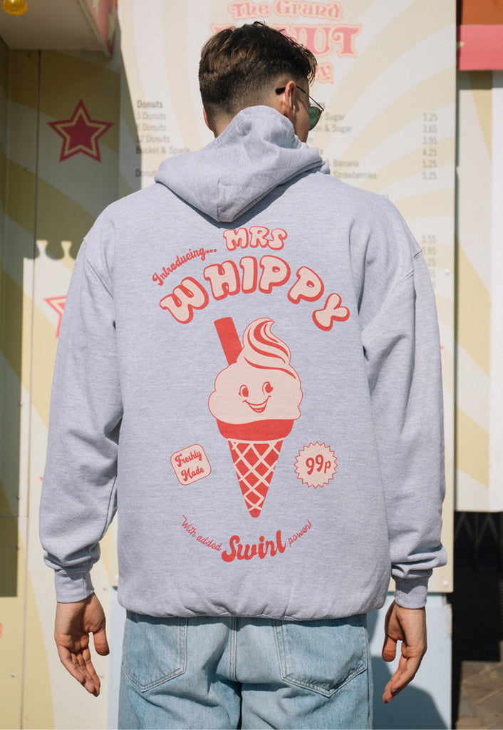 Batch1Men's printed hoodie with “Mrs Whippy” slogan and vintage style ice cream character graphic.