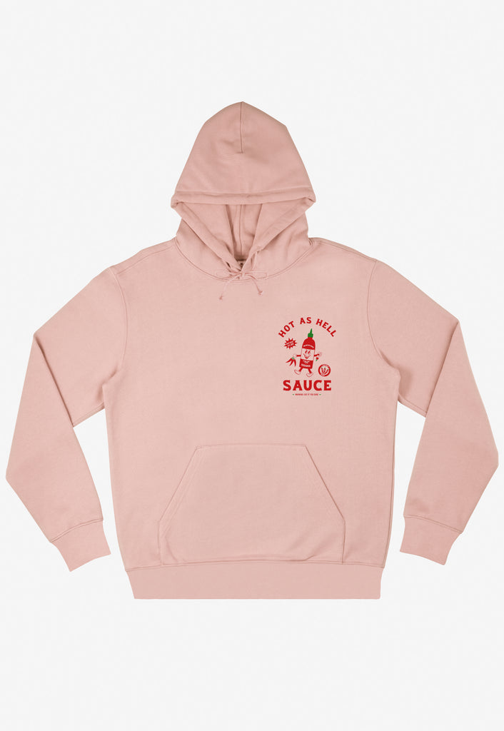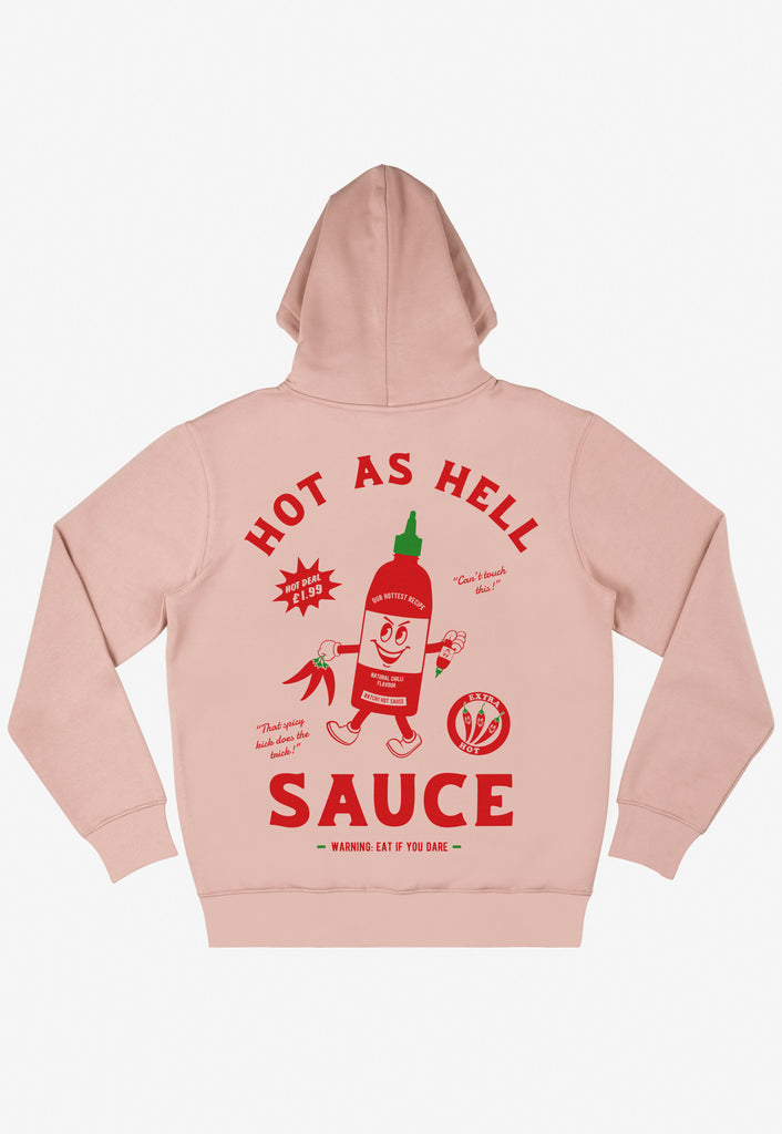 Relaxed hoodie in peach with printed hot sauce logo and vintage style character. Small logo to front, large back print.