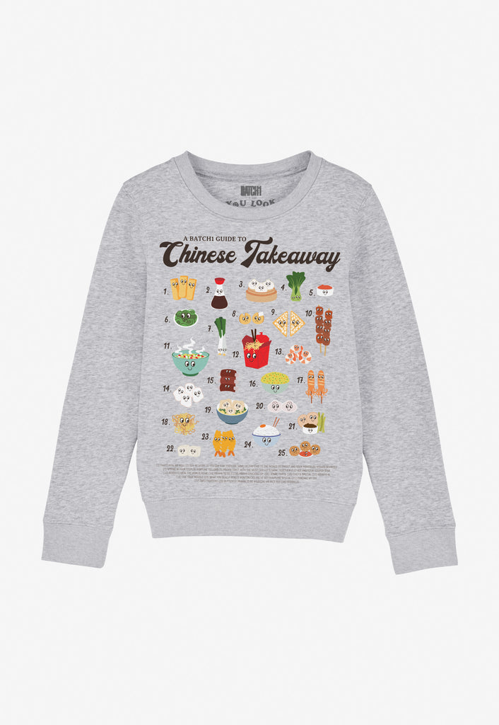 Batch1Children's unisex super-soft sweatshirt in grey with printed “Chinese Takeaway” slogan and illustrated guide to Chinese food!