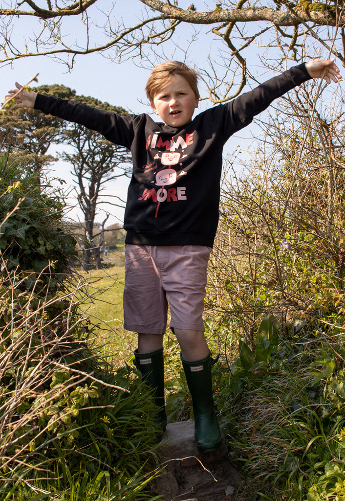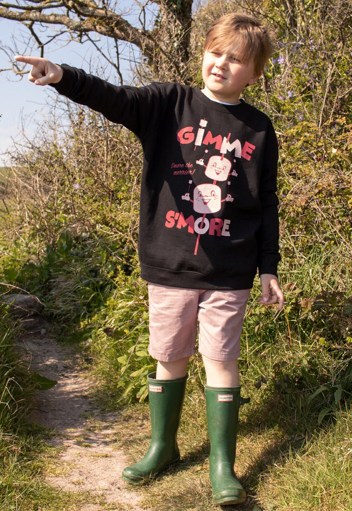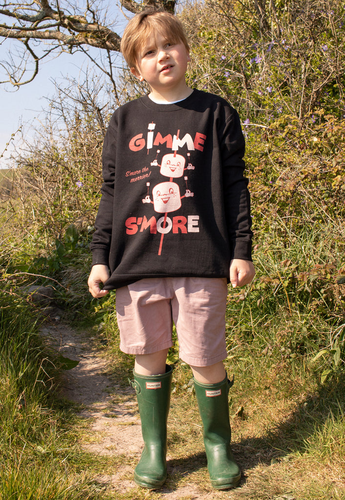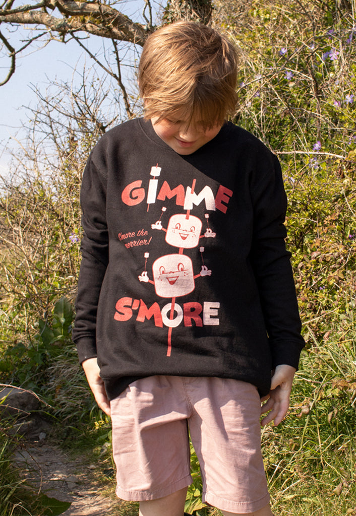 Batch1Children's eco-printed sweatshirt with “Gimme S'more” slogan and toasted marshmallow characters.