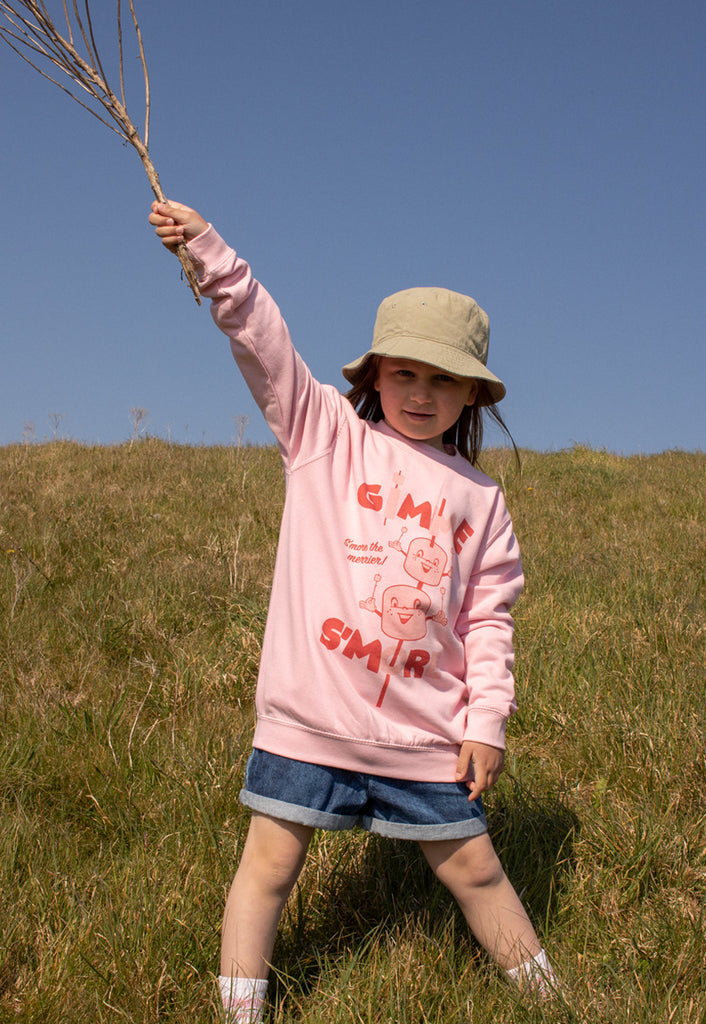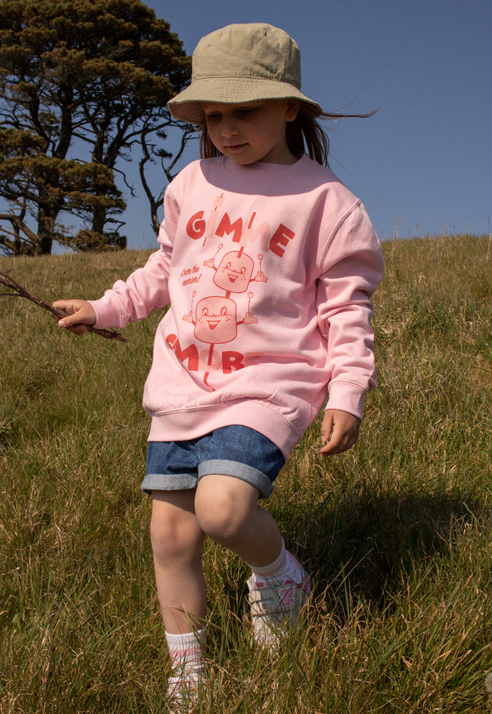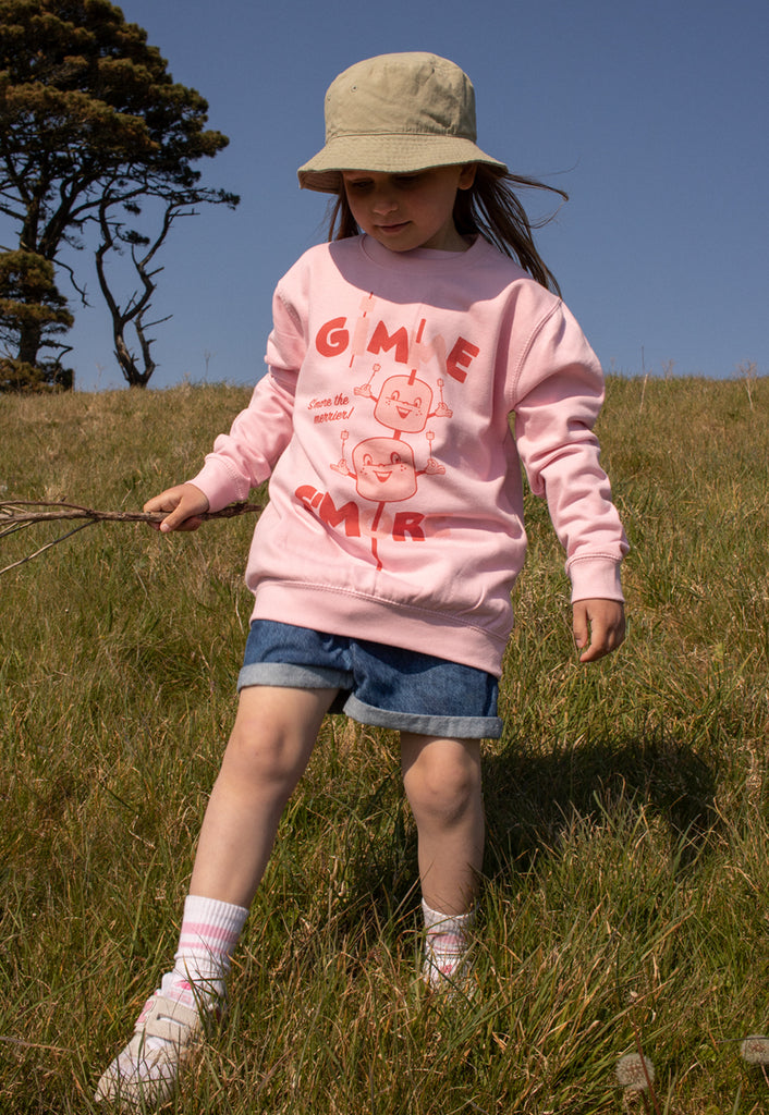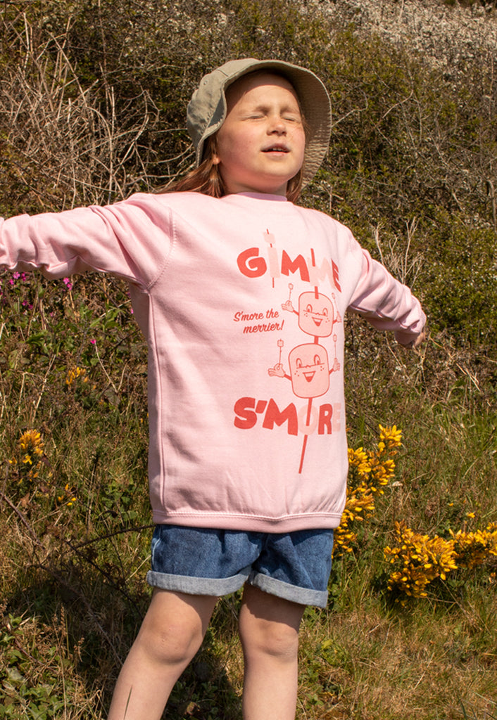 Children's eco-printed sweatshirt with “Gimme S'more” slogan and toasted marshmallow characters.
