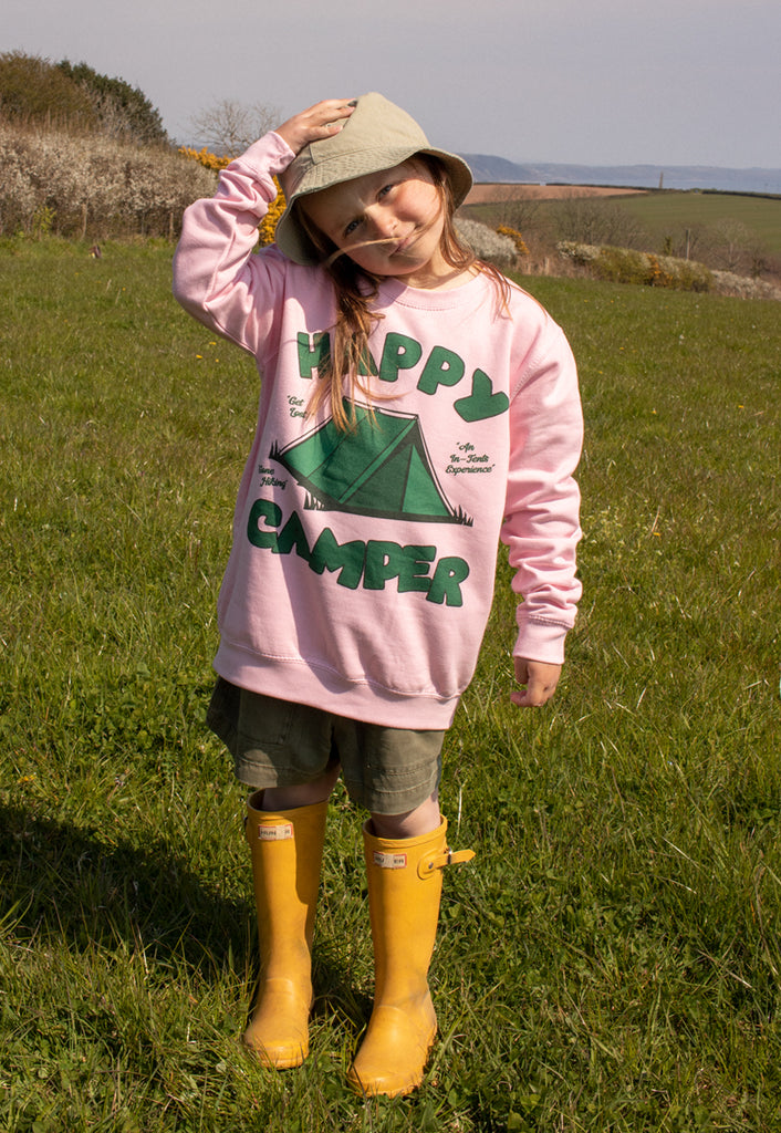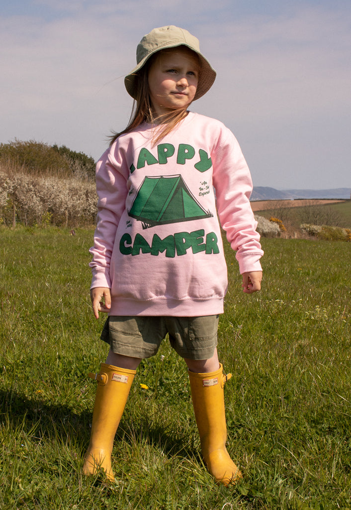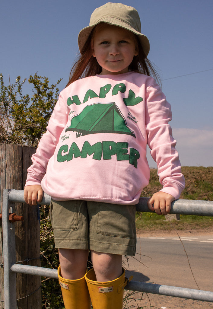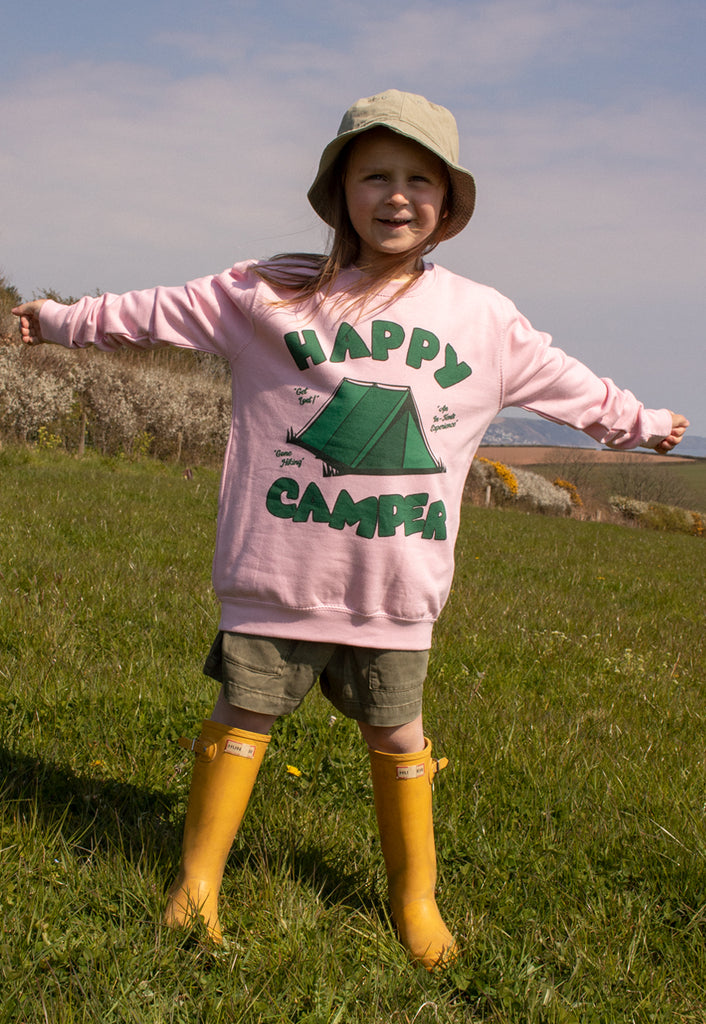 Batch1Children's eco-printed sweatshirt with “Happy Camper” slogan and tent graphic.