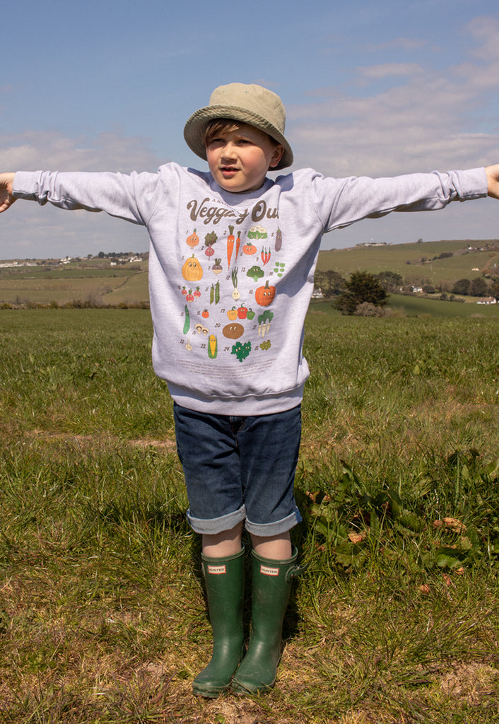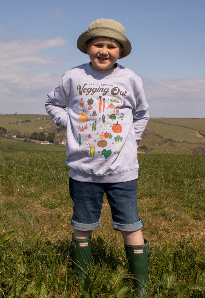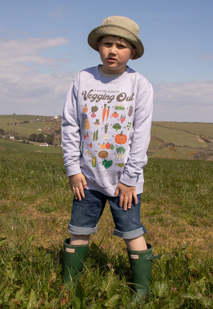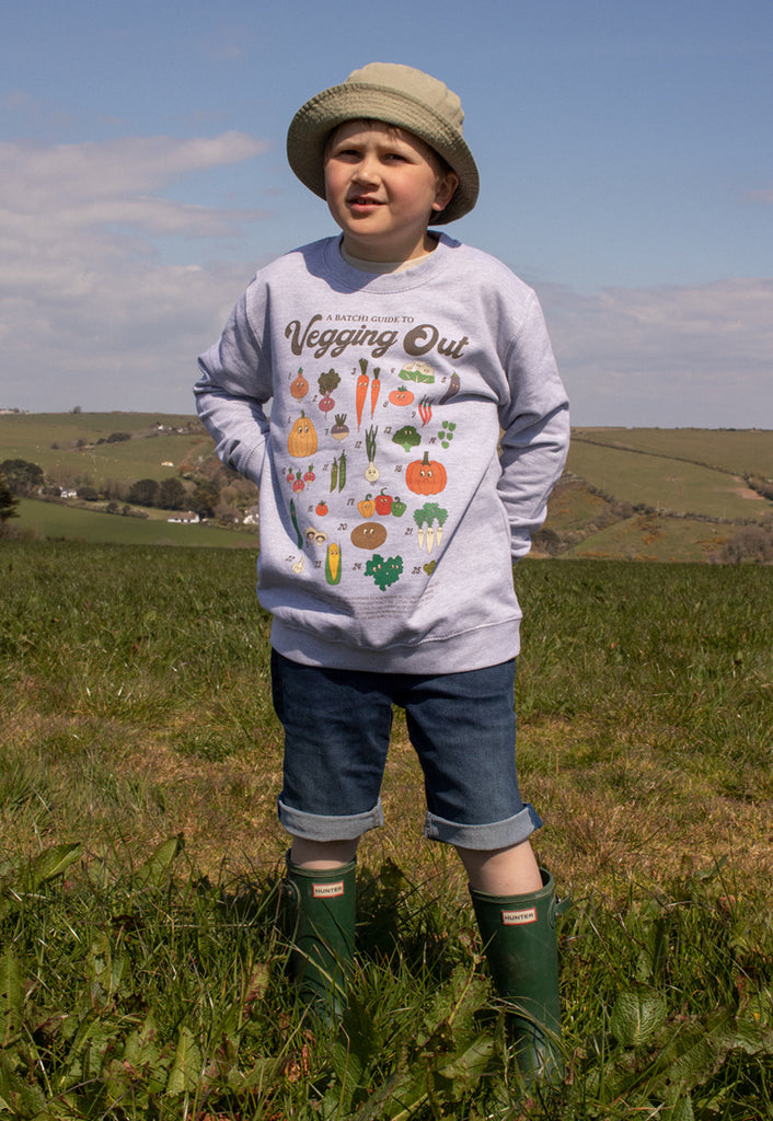 Batch1Children's eco-printed sweatshirt with “A Batch1 Guide To Vegging Out” slogan and illustrated field guide to Batch1 vegetables.