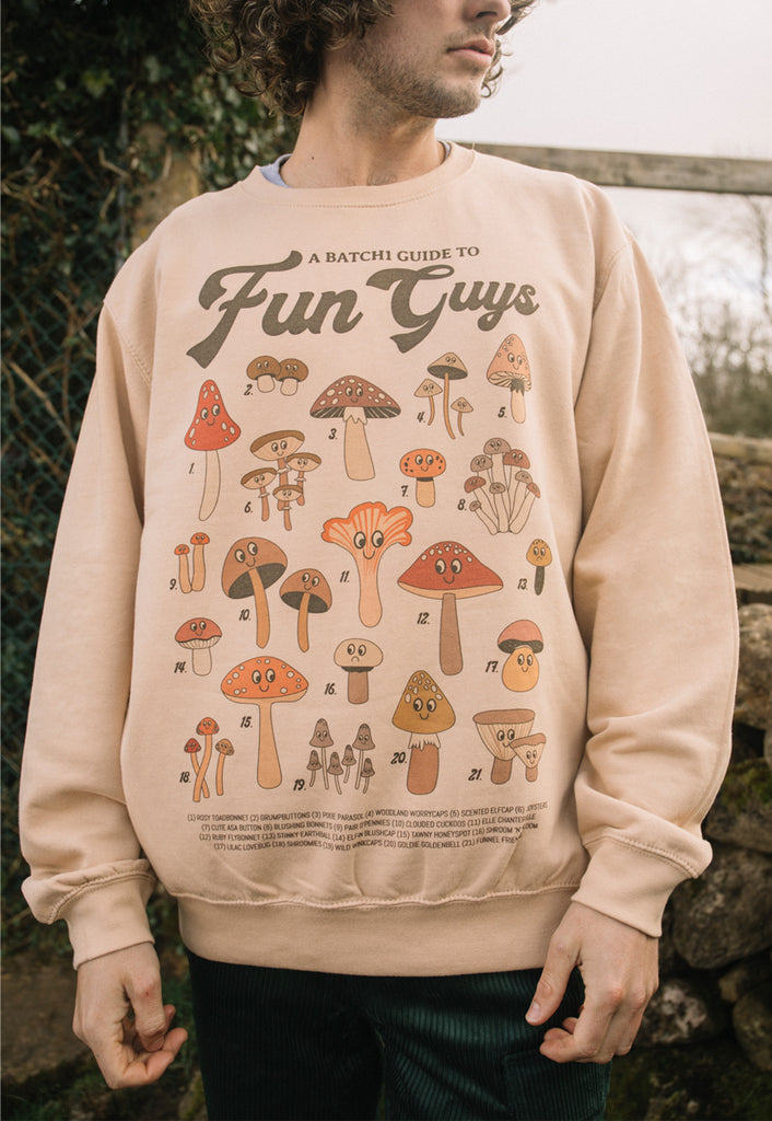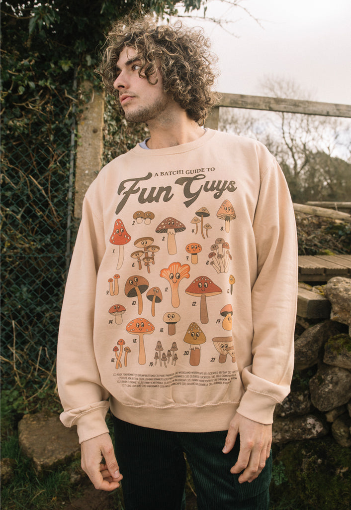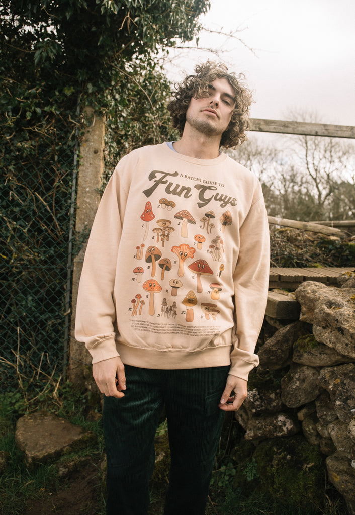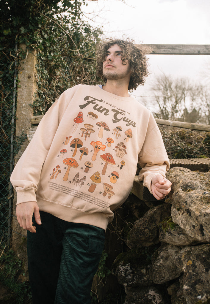 Batch1Super-soft men's sweatshirt with “A Batch1 Guide To Fun Guys” slogan and illustrated field guide to Batch1 mushrooms.