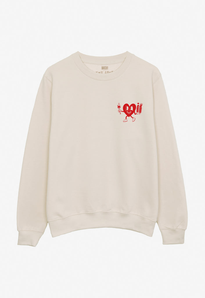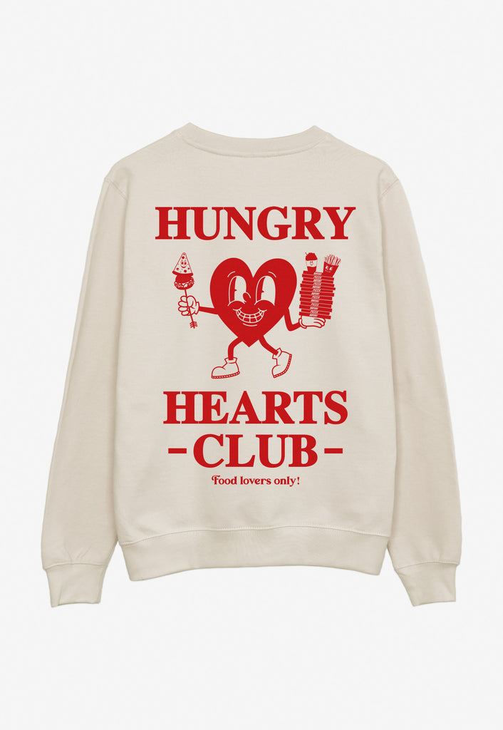 Relaxed crew neck vanilla sweatshirt with vintage style heart character graphic and “Hungry Hearts Club” slogan. Food lovers only!