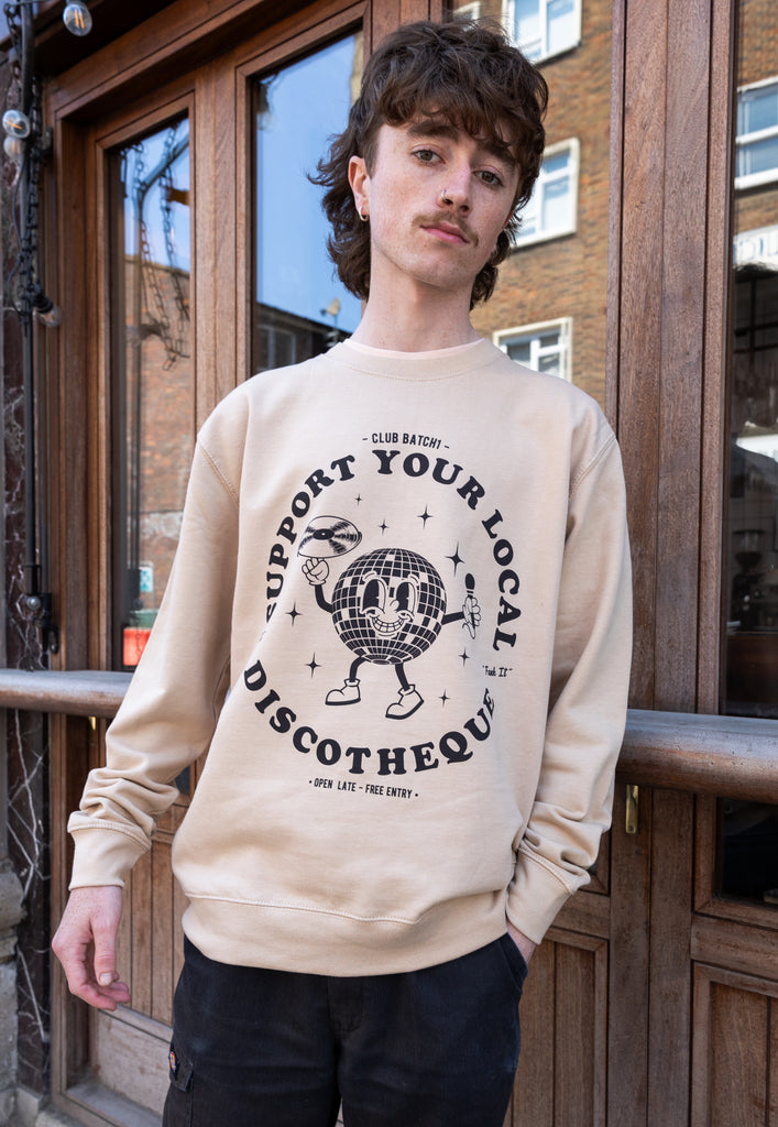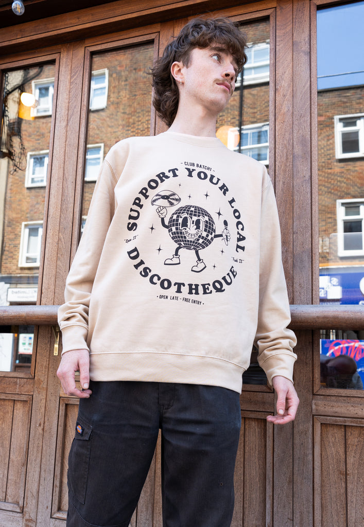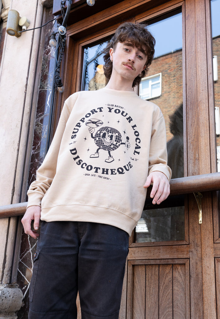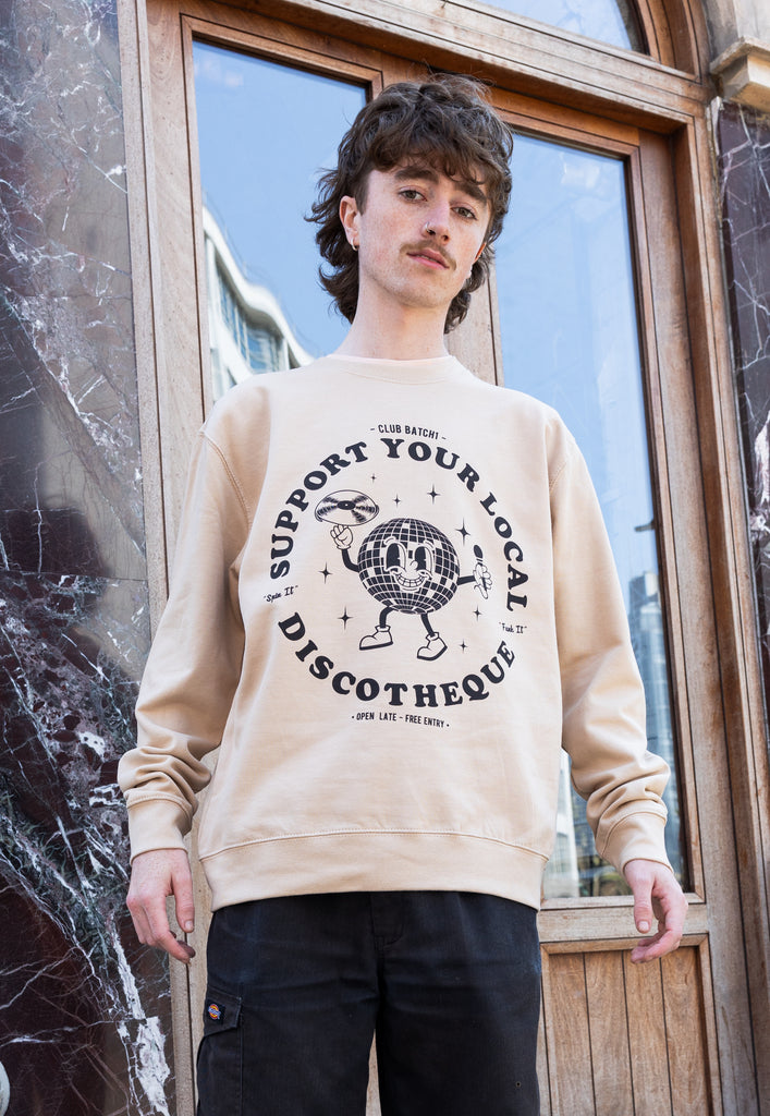 Relaxed crew neck sand sweater with printed “Support Your Local Discotheque” slogan and disco ball character.