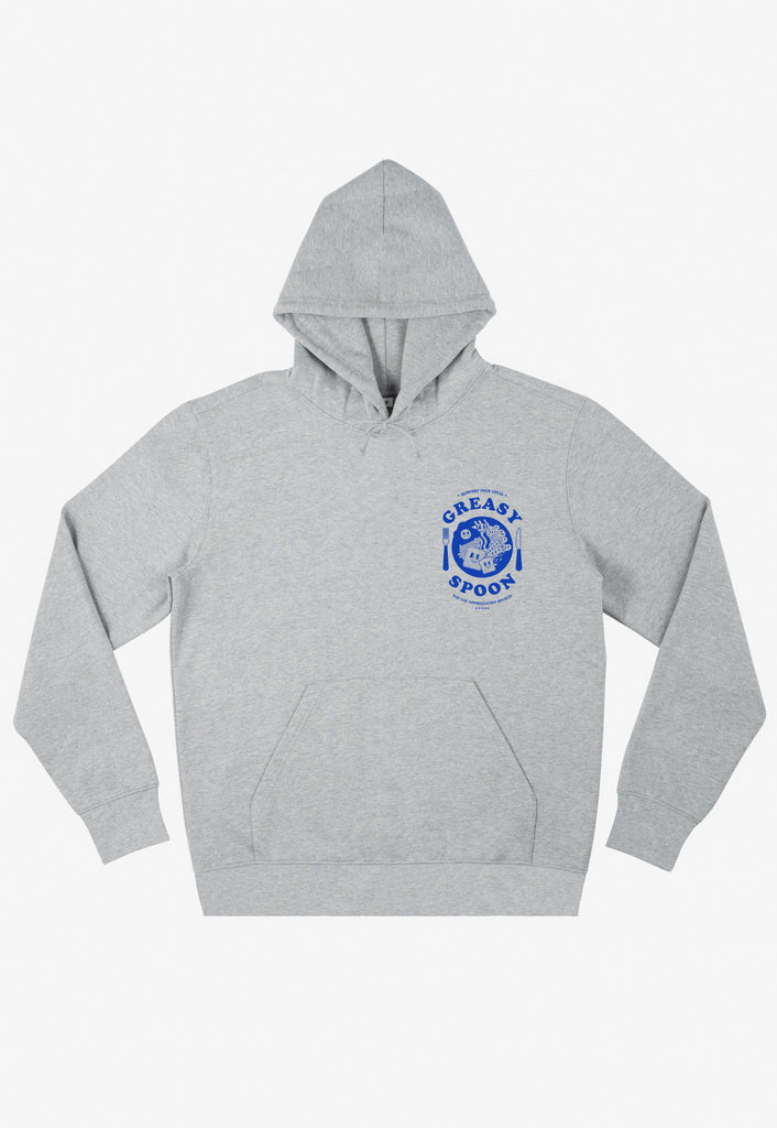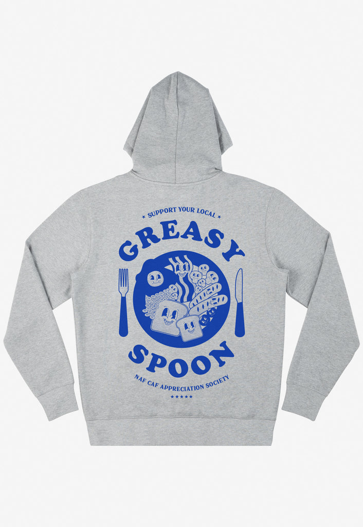 Relaxed grey hoodie with printed greasy spoon breakfast logo and vintage style food characters.