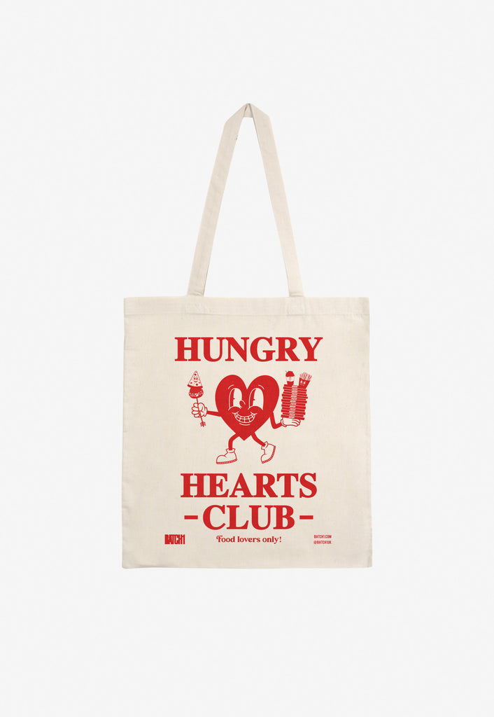 Natural cotton tote bag with printed vintage style heart character graphic and “Hungry Hearts Club” slogan. Food lovers only!