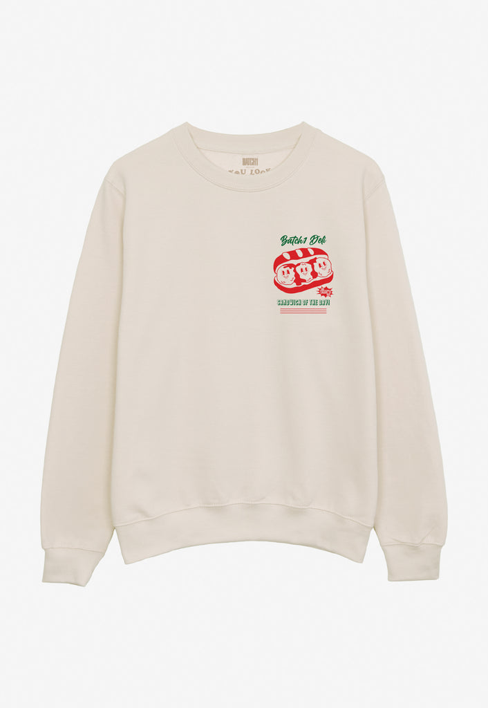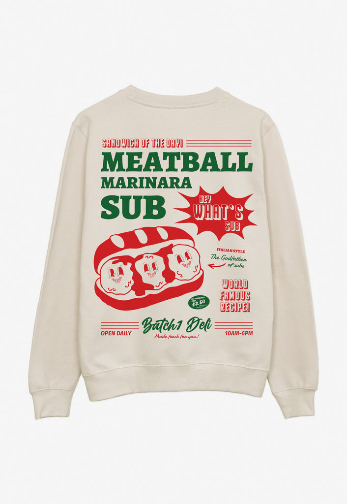 Relaxed crew neck vanilla cream sweatshirt with Batch1 Deli Meatball Sub poster print and vintage style sandwich character.