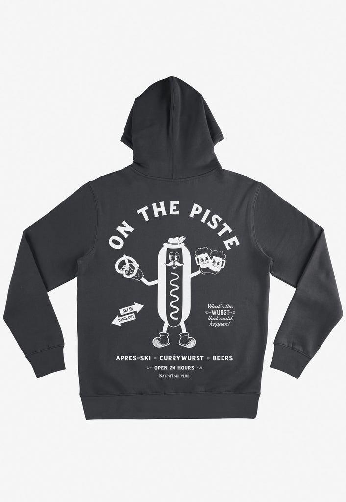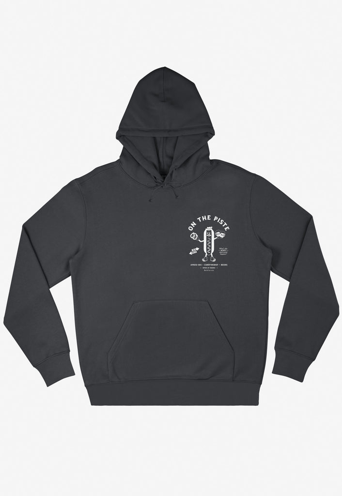 Relaxed hoodie in dark grey with printed currywurst vintage style character and après ski slogan.
