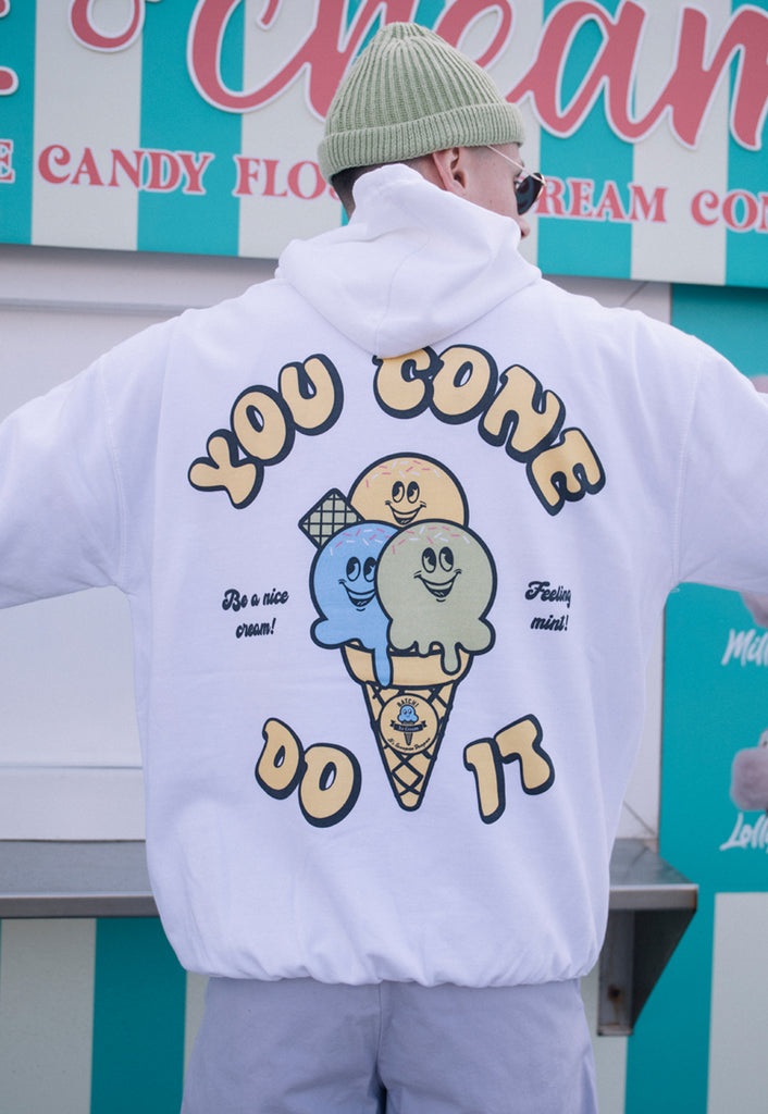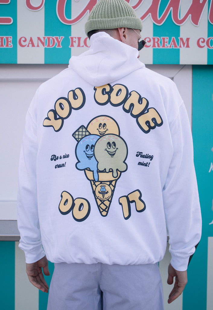 Batch1Men's printed hoodie with “You Cone Do It” slogan and vintage ice cream cone character graphic.